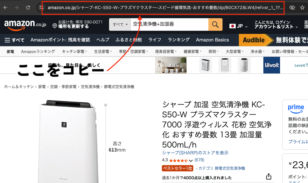 気になる商品のURL(Amazonの商品ページ)をコピーします。