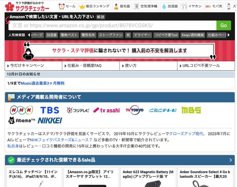 さくらチェッカーは、Amazonの商品ページのURLを入力すると、その商品の口コミに不自然な点がないかを自動で分析する無料のウェブサービスです。